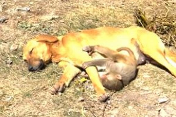 そこで子供のサルと仲良く過ごす妊娠したメスの犬を発見。その様子を撮影しました。