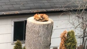 野生動物 切り株の上ですやすや…可愛らしいキツネの眠る姿に癒される